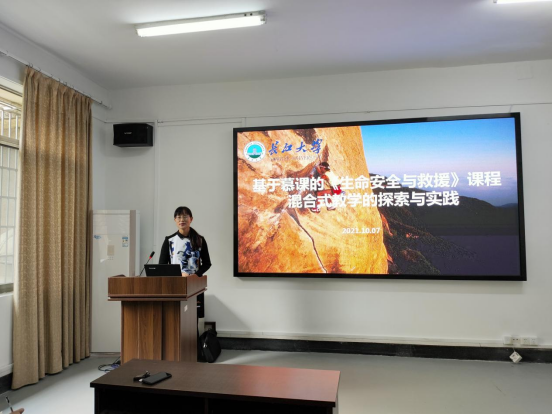 首先,体育教育系路国华教授做了题为“基于慕课的《生命安全与救援》课程混合式教学的探索与实践”的经验分享,从教学目标、教学设计、教学方法、成绩评定、创新特色五个方面,谈了个人的做法。路教授提出了课程创新的五点特色:既有“用”又有“建”;既有动手操作又有社会实践;科学合理规划课;以学生发展为中心,注重实践能力,培养终身学习习惯;坚持“三个融合”人才培养思路。