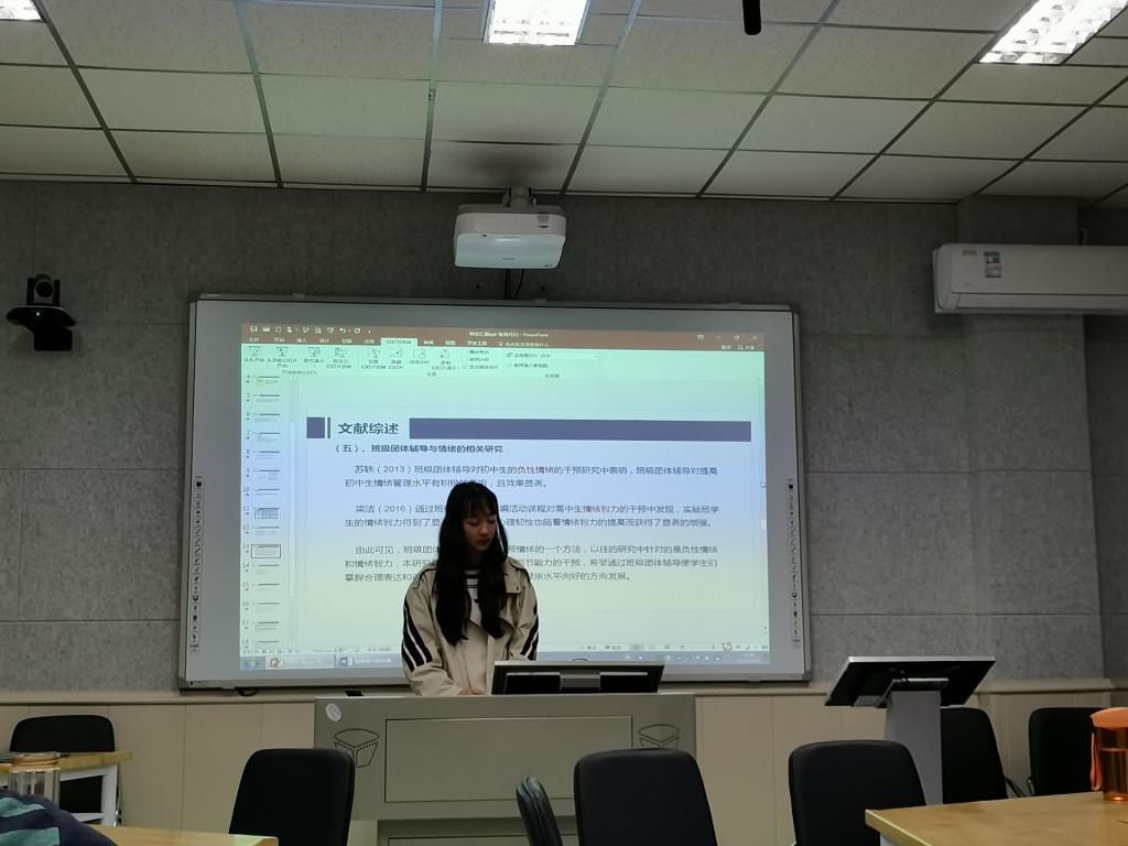汇报结束后,同学们对张竞月同学汇报的内容进行了讨论,主要集中在团体辅导的设计依据,实施过程中无关因素的影响。随后老师们进行了指导。首先张老师提出团辅方案要具体,凸显和其他研究方案的区别;文献综述部分对于研究现状一定要有数据支撑,其次是要有情绪调节能力和心理健康关系的介绍。最后在理论支撑、方案的实施提出了建议。随后郑老师提出,假设部分要有规范性,综述部分情绪、情绪调节的概念要有准确的把握,并建议可以用情绪ABC理论作为支撑。最后严老师就理论背景、团辅方案有效性等方面提出了建议:要对团体辅导和情绪调节能力的相关研究做全面的把握,即了解相关方面的研究趋势,目前的成效等。其次是对于情绪调节能力的干预,要根据情绪调节的操纵性定义的具体方面,来具体化自己的团体辅导方案,即要真正做到有效,要对变量进行有效的操纵,还要考虑效度等方面。
