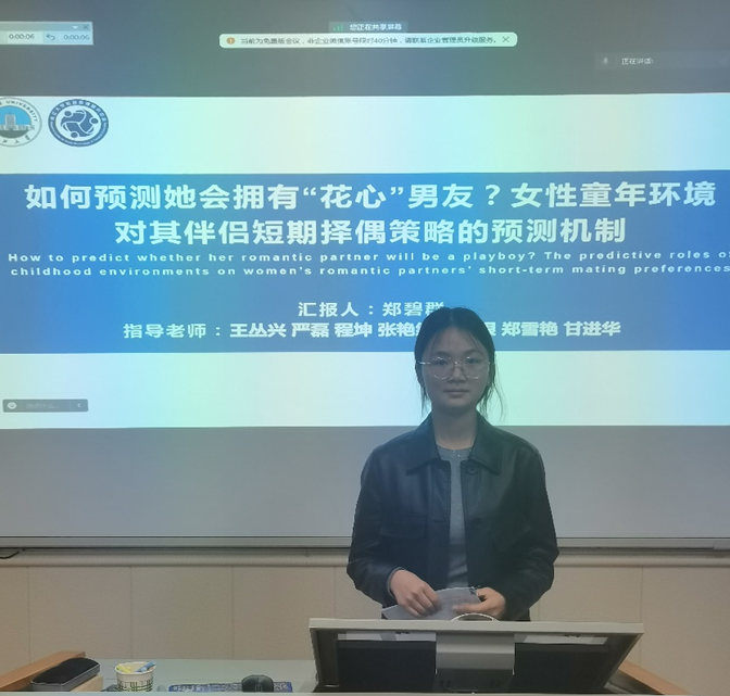 首先,郑碧群同学对《如何预测她会拥有“花心”男友?女性童年环境对其伴侣短期择偶策略的预测机制》这篇文献进行汇报。该文献进行了2项研究,结果发现:童年父女关系和童年环境不可预测性能共同预测女性自感配偶价值。在童年环境不可预测性较低或不可预测性与艰苦性均高的情况下,童年父女关系会通过女性自感配偶价值的中介作用,进而预测其伴侣的短期择偶策略倾向或女性对伴侣 “花心” 表现的容忍程度。