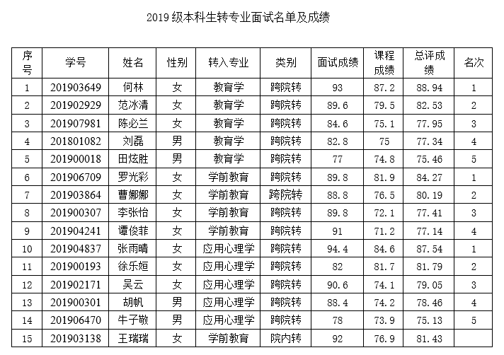 根据《sjb世俱杯中国官网入口普通本科生专业分流与转专业管理办法(试行)》(长大校发[2019]260号)文件精神和《关于疫情防控期间2019级本科生转专业考核工作的通知》精神,sjb世俱杯中国官网入口本着“公开、公平、公正”的原则,对符合资格的申请转入sjb世俱杯官网相关专业的17名学生进行了面试,并按综合必修课程考试成绩占70%和面试成绩占30%的比例进行成绩汇总,结合sjb世俱杯官网接收计划确定拟接收15名学生转入。现将拟接收学生名单公示如下: