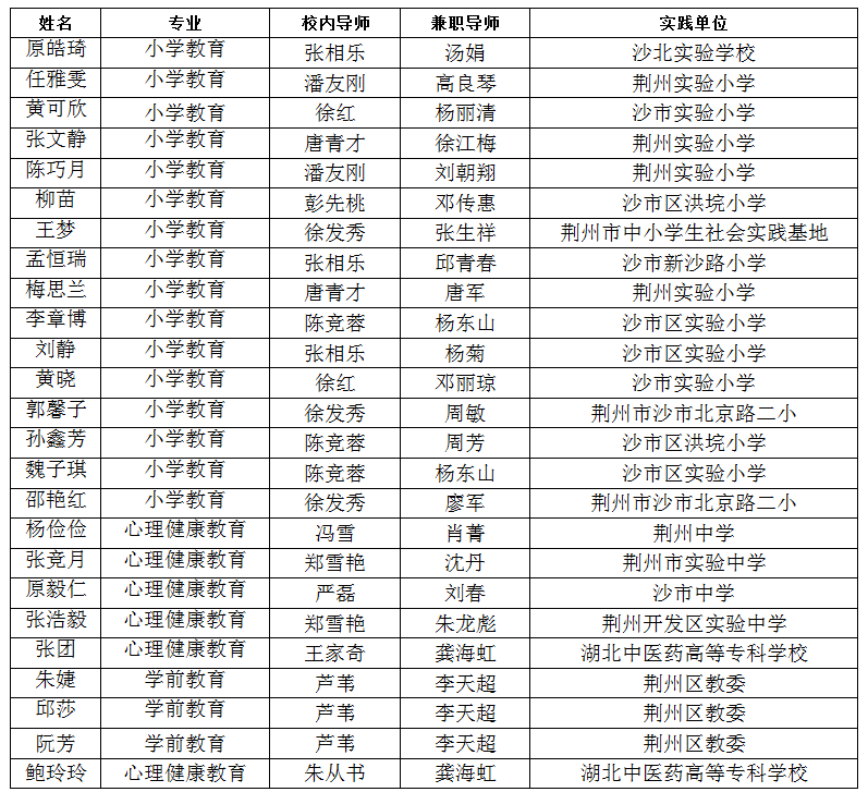11月1日,sjb世俱杯官网2020级小学教育、学前教育、心理健康教育25名教育硕士,按照培养方案及全国教育专业学位研究生教育指导委员会的教育硕士实践教学基本要求,奔赴荆州市12所中小学、1所高校及荆州区教委下属的幼儿园开展为期一周的教育见习。