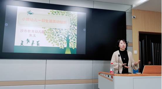 朱玉园长有着多年的办园经历及丰富的教学经验,首先向大家展示了沙市教育幼儿园《2019年幼儿作息时间表》,帮助同学们了解幼儿园的一日生活环节和时间安排。随后,朱园长以幼儿园小班的“美好入园来”、“趣味来盥洗”、“轻松如厕去”、“科学来喝水”、“温馨进餐点”、“甜蜜午睡时”、“幸福离园曲”和“户外懂保护”八个模块为报告主线,对幼儿园一日活动环节进行系统阐释,运用生动鲜明的视频展示了幼儿一日活动安排的总体规范要求与内涵和价值。同时,朱园长介绍了当前疫情状态下幼儿园一日活动环节的变化与要求以及该园“儿歌建常规”、“光盘行动”、“劳动教育”等特色活动。