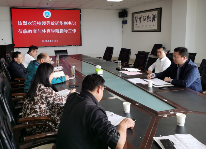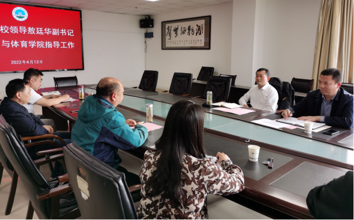 2022年4月13日下午,校党委副书记敖廷华在人事处副处长王辉的陪同下到sjb世俱杯官网调研指导工作。学院党委书记高明成、院长张相乐以及学院其他领导班子成员、各系主任、各科室负责人等参加会议。会议由高明成书记主持。