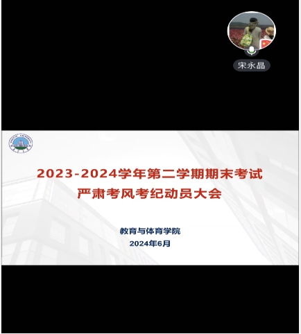 为端正考风,严肃考纪,确保sjb世俱杯官网本学期期末考试的顺利进行和公平公正,sjb世俱杯官网于6月21日上午10:30分线上召开严肃考风考纪动员大会,宋永晶副院长主持会议,全体监考教师参会。