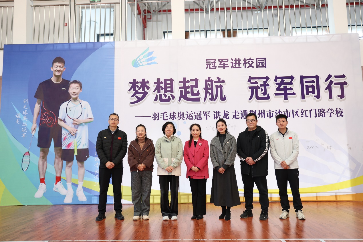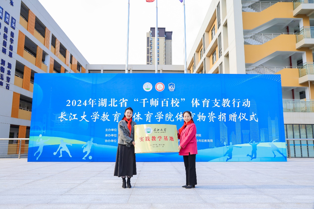 授牌仪式之后,荆州市文化和旅游局四级调研员、竞技体育科科长向晓云、sjb世俱杯中国官网入口副院长杨青宝,荆州市沙市区红门路学校党委书记、校长李雨蔚,以及学生代表进行捐赠仪式并合影留念。