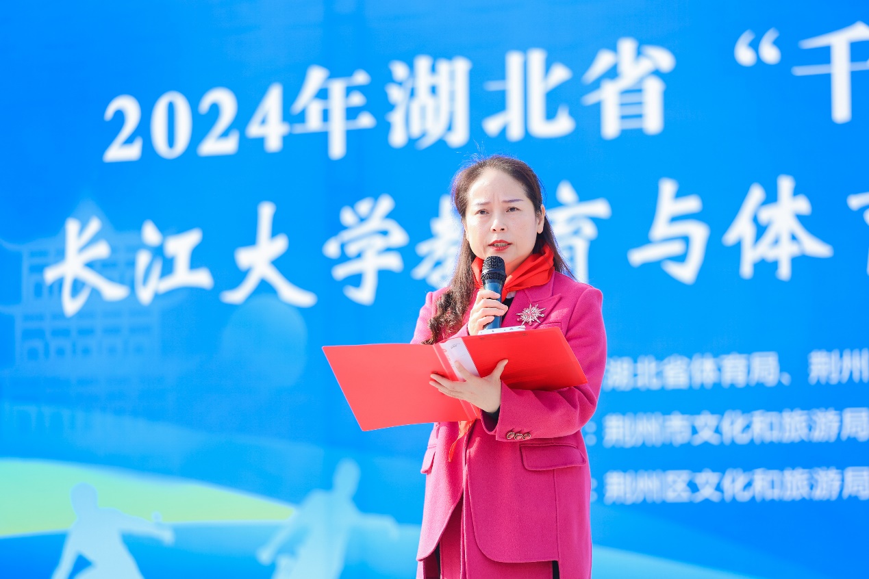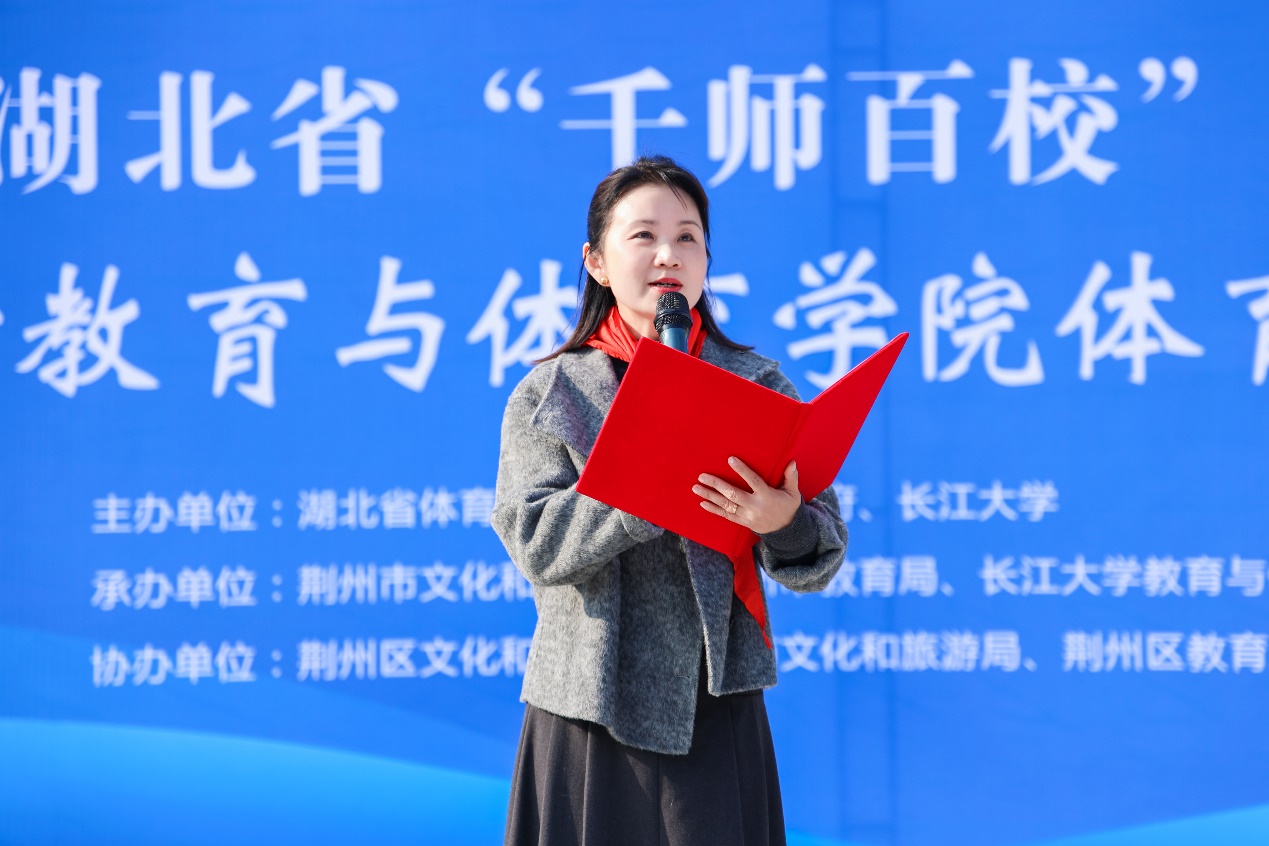 然后,荆州市沙市区红门路学校党委书记、校长李雨蔚致欢迎词,李书记对出席本次仪式的领导、老师致以最热烈的欢迎和最诚挚的谢意,她表示,将切实落实“尽体育之责、强体育之教”的活动宗旨,让支教活动受益于学生、让支教志愿者们成长于学校。