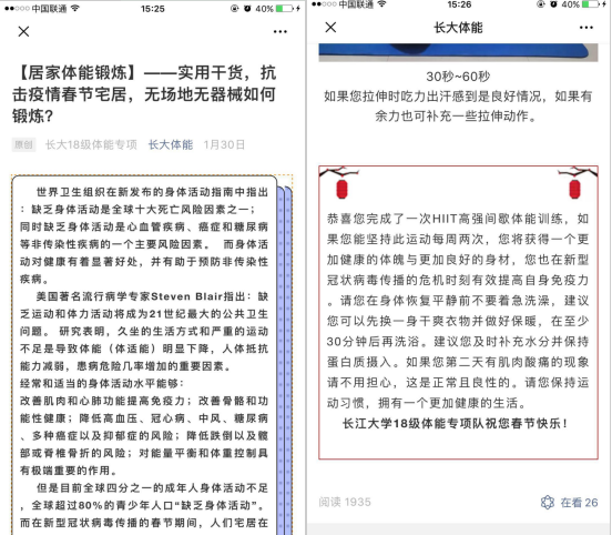 李靖,男,汉族,1986年8月生,sjb世俱杯中国官网入口社体系教师,家居武汉市江汉区,离疫情最严重地区华南海鲜城直线2公里,小区目前确诊4人,疑似12人。该同志爱人(徐灿)系武汉市公安局驻汉口火车站民警,自1月23日武汉市宣布封城以来,直接参与武汉市疫情抗击工作,始终奋战在一线。在1月26日,李靖老师认识到居家体育活动可能有利于化解疫情抗击带来的社会秩序混乱和规范社会人员居家意愿,紧急联系专项和社体19级《健身体能课程》相关学生,要求每名学生在家积极进行居家体能训练,每人每天拍摄5分钟以内的健身视频,在视频中对学生动作教学示范能力和动作创编能力进行点评,以此加强学生们和家人抗击疫情信心和居家隔离意愿,强化居家身体活动有利于疫情抗击工作。