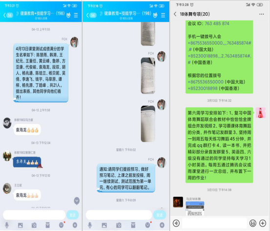 教学实施阶段,樊翠红同志从新型肺炎防控宣传和学生的心理疏导入手,先做好卫生和健康教育,疏导学生的恐慌和紧张情绪;注重学生学习能力培养,提倡学会学习与学习知识同等重要的教学指导思想;课前,利用幕课资源、发放教学预习资料、预设启发式问题进行课前预习;课中,重组教学内容,采用知识点归纳、每课测评、讨论等形式打造30分钟小节课堂,较好地完成了重难点精讲和在线辅导答疑;课后,让学生整理笔记,录制训练视频,自主练习居家防疫操等形式, 增加学习信心,激发学生顽强拼搏的精神斗志,提振士气。