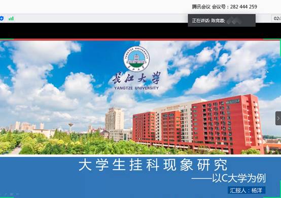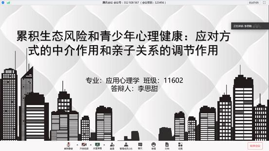 正式答辩开始之前,各答辩组长宣读本次答辩要求和注意事项,随后学生依次采用屏幕共享PPT的方式进行论文陈述,老师根据学生的陈述对论文提出专业方面的问题,每位学生有10分钟左右时间思考并做详细论文答辩。所有学生答辩结束之后,答辩组老师就学生论文情况进行总体点评。最终整个答辩过程历时五个小时,毕业论文答辩工作圆满完成。