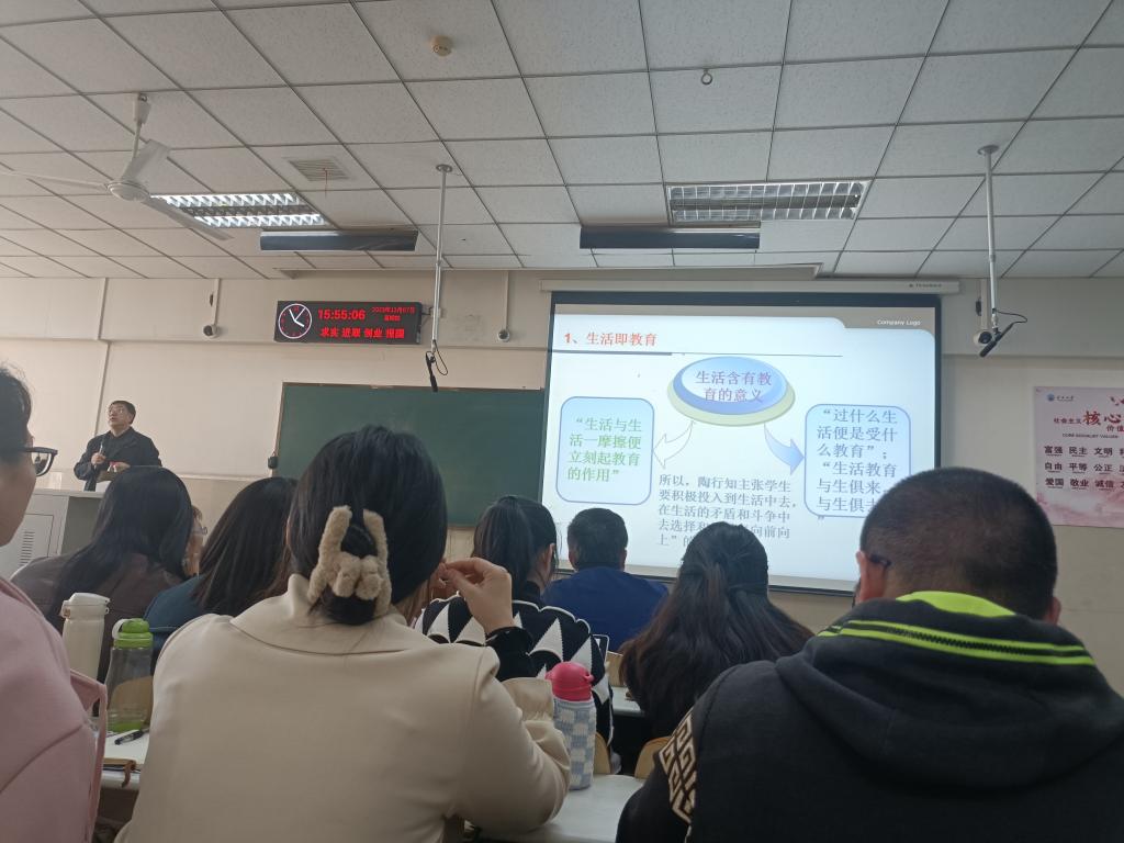 第一部分,申国昌教授从陶行知先生的故乡安徽黄谭源村起,为我们详细的讲述了陶行知先生的主要事迹:陶行知先生在1915年进入哥伦比亚大学研究教育,与我国著名学者胡适、陈鹤琴等为同学;求学回国后先后在南京高等师范学校、东南大学任教。在这期间,陶行知先生提出了教育法律、女子教育等教育思想;并与蔡元培先生发起成立中华教育改进社;辞职后开办南京晓庄学院;在1932年成立山海工学团,提出小先生制;1939年抗战期间在重庆创办了育才学校。后被世人称为伟大的人民教育家。