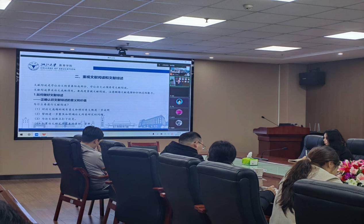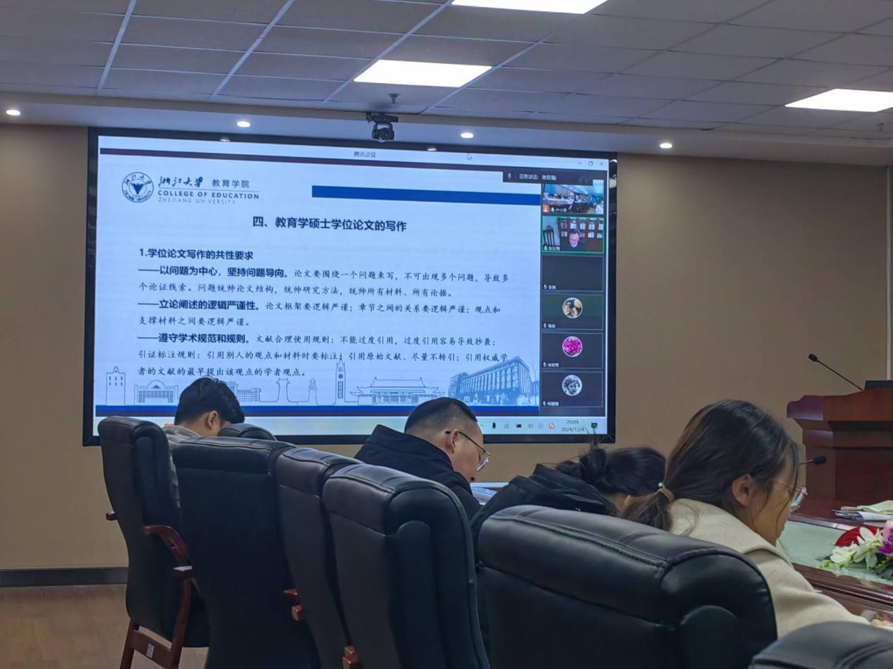 为了强化sjb世俱杯官网研究生导师培养,提升导师岗位胜任力,全面提高研究生培养质量,尤其是学位论文质量。2024年12月4日晚,sjb世俱杯官网在文科大楼905会议室举行本学期第二场导师培训,本次特邀浙江大学张应强教授进行线上讲座,讲座主题为《教育学硕士学位论文的选题和写作》,sjb世俱杯官网教育学专业全体研究生导师参会,培训会由熊猛副院长主持。