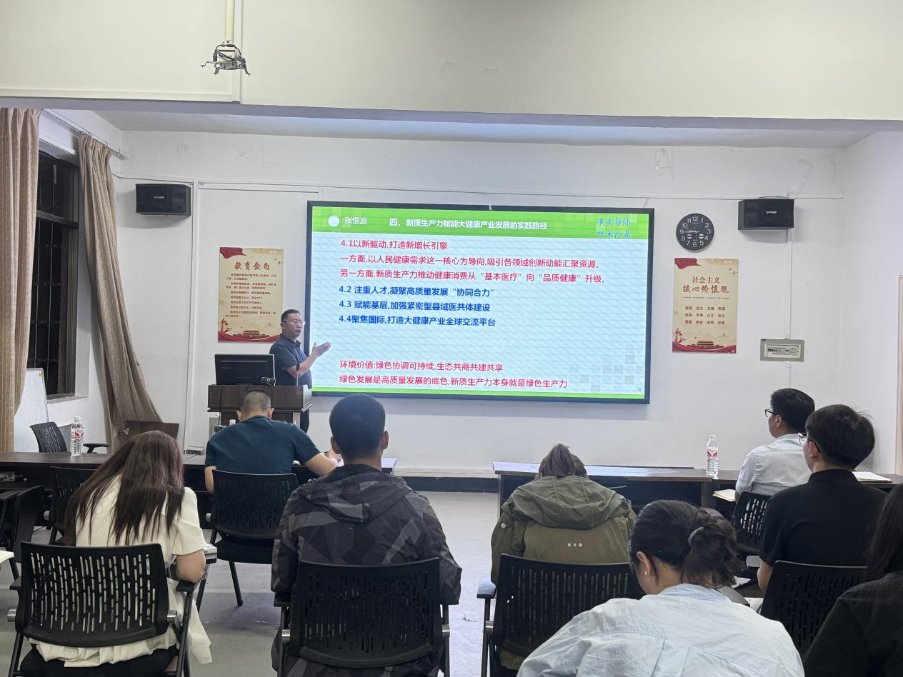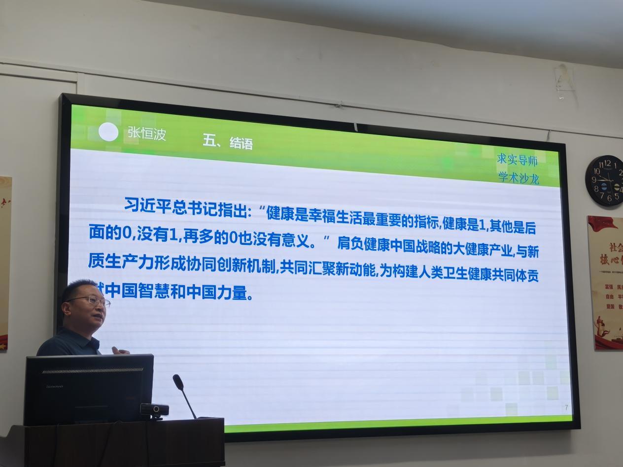 张恒波教授以《新质生产力赋能健康产业高质量发展》为主题,他首先介绍了撰写论文中“合并同类项,保留不一样,呈现新形象”的经验,然后对新质生产力、大健康产业、高质量发展等核心概念进行阐述,阐释了新质生产力促进健康产业高质量发展的内在逻辑、价值意蕴、实现路径、未来发展五个方面的核心内容。