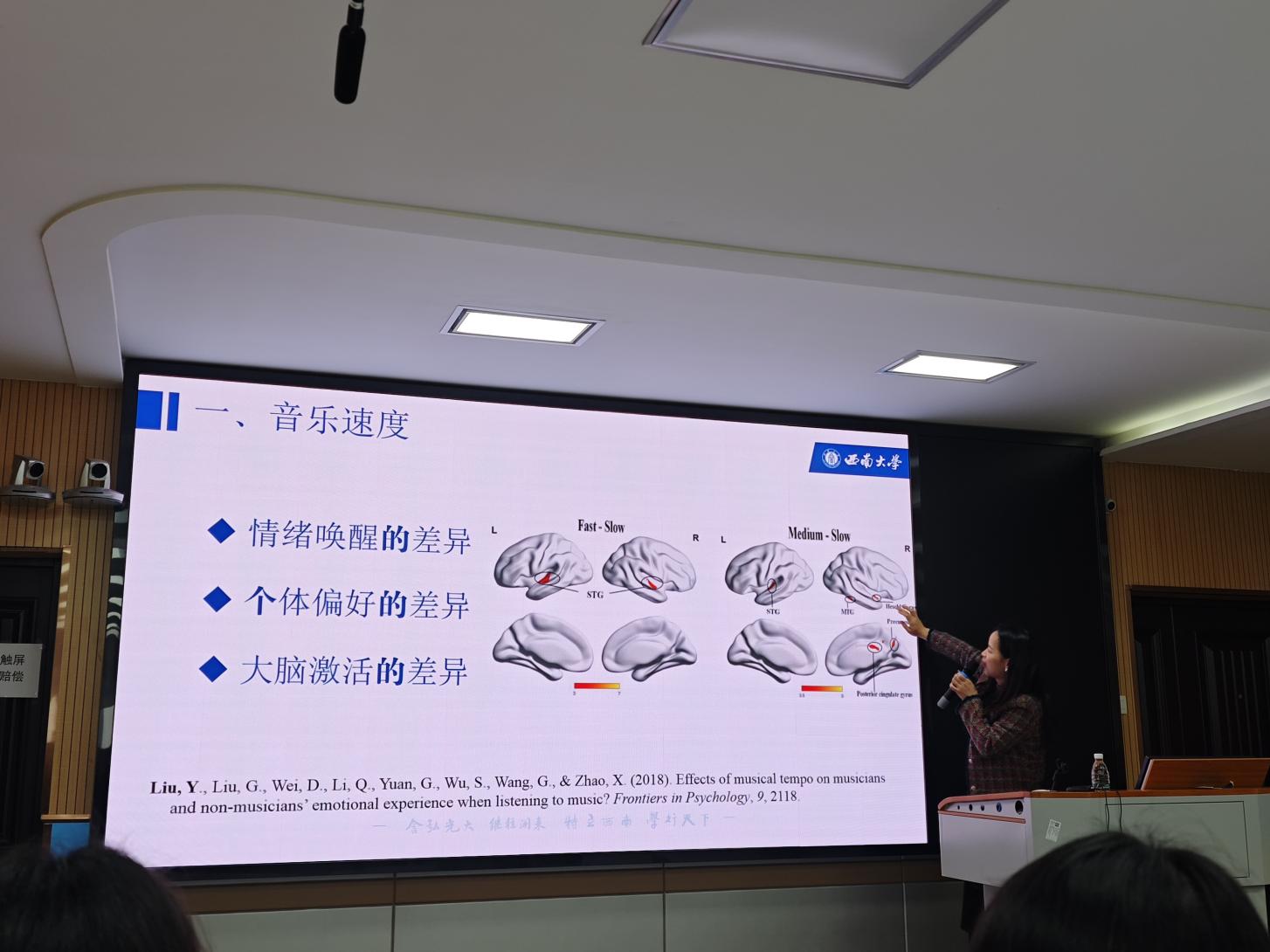 刘颖博士从音乐速度在情绪唤醒、个体偏好、大脑激活三个方面的差异引入,通过播放不同速度的音乐刺激,让听报告的同学感受音乐速度对情绪唤醒的影响,她结合现实举例,指出在商场、咖啡厅、西餐厅、快餐店等不同场景中播放的舒缓程度不同的音乐是有科学依据的。