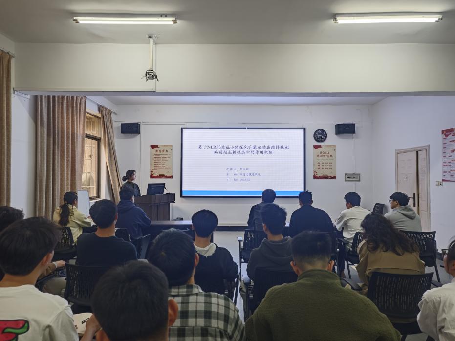 胡淑娟博士从主题选题依据、研究目的与意义、创新之处、研究思路与结果、结论、问题与展望六个方面展开。她首先向学生们介绍了糖尿病前期、运动与糖尿病、NLRP3炎症(小)体与糖尿病、运动、NLRP3炎症体及T2DM的关系,揭示了该研究的背景与可能性。同时以NLRP3炎症小体的视角探究有氧运动对糖尿病前期患者(慢性病患者)等的独特价值与采用有氧运动与现代分子医学交叉的方法,通过临床干预实验、动物实验和细胞实验的结合,首次尝试建立小鼠PDM模型对NLRP3炎症小体在有氧运动维持葡萄糖稳态的作用机制进行研究。