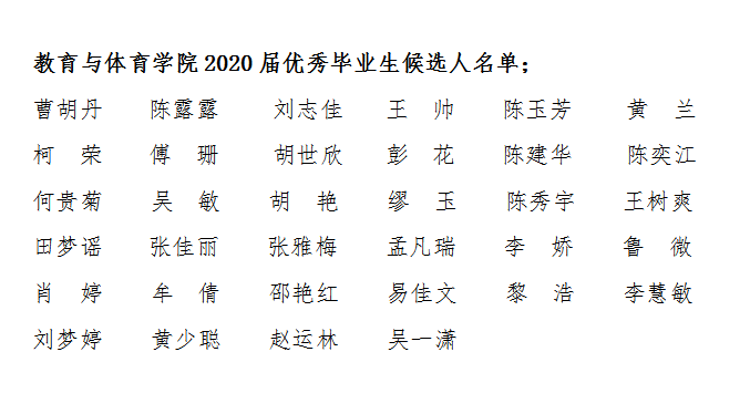 根据中共sjb世俱杯中国官网入口委员会学生工作部《关于开展2020届优秀毕业生评选与表彰工作的通知》精神,经学生本人申报、班级提名、学院审核,评选出陈露露等34名同学为教育与体育学院“sjb世俱杯中国官网入口2020届优秀毕业生”候选人,现对上述人选予以公示。