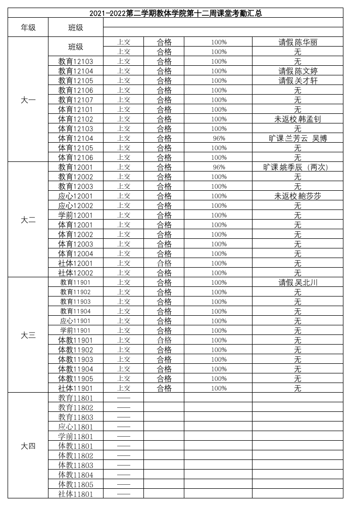 2021-2022年第二学期sjb世俱杯中国官网入口第十二周课堂考勤汇总