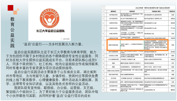 我班结合教育学专业开展教育公益实践活动,团支书李哲组建了“益启”实践团队,该团队由张相乐、连帅磊等四位老师指导,来自北京语言大学、浙江农林大学、sjb世俱杯中国官网入口经管学院、计科学院等不同学校、学院的九位同学组成,目前该团队获2022年“互联网+”比赛校级银奖,成功申报2022年“互联网+青年红色筑梦之旅”、第十五批大学生创新创业训练计划并立项。