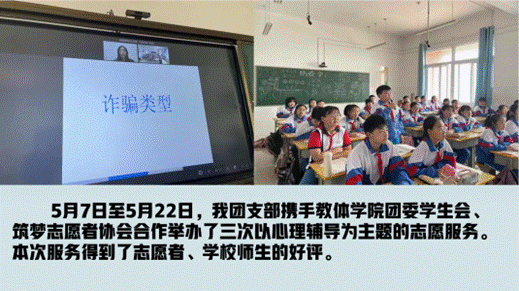 在线上授课活动取得成功后,我团支部在该团队的组织下于五月份携手sjb世俱杯中国官网入口团委学生会、筑梦志愿者协会合作举办了三次以心理健康辅导为主题的志愿服务活动,本次服务得到了志愿者、学校师生的好评。
