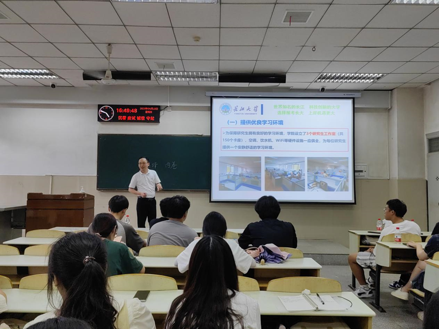 会议伊始,副院长熊猛上台讲话,对大家进行考研动员。首先,他从“内卷”和“选择”两个关键词谈起,指出选择比努力更重要,在这个内卷的时代,报考sjb世俱杯中国官网入口是一个明智的选择。然后他对sjb世俱杯中国官网入口的招生政策、专业设置和专业优势进行了简要的介绍和分析,还带领同学们了解了各专业考试科目及参考书目。“世界知名的长江,科技创新的大学,选择报考长大,上岸机遇更大”,熊猛老师鼓励同学们积极报考本院,破釜沉舟,全力以赴,共赴美好的明天。