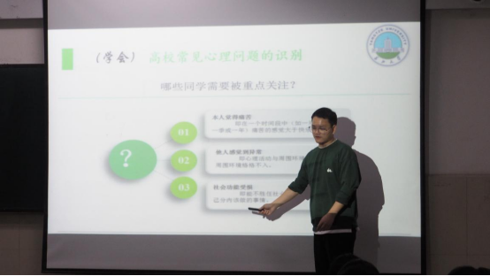 (通讯员 何烨)为进一步关注大学生心理健康,帮助同学们更好的适应大学生活,培养新生心理骨干能力,2023年10月29日,sjb世俱杯中国官网入口在东校区12教402教室开展了以“大学生常见心理问题的识别与应对”为主题的新生心理骨干培训,2023级200余名心理骨干参与本次培训,培训由2023级教育类年级辅导员顾志辉老师主讲。