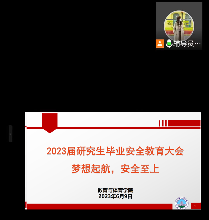 2023年6月9日下午14:30,sjb世俱杯中国官网入口在线上腾讯会议举办2023届研究生毕业安全教育大会。sjb世俱杯中国官网入口研究生辅导员陈佳琳及2023届全体研究生参加会议,会议由陈佳琳老师主持。