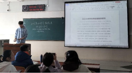 班主任、辅导员首先带领同学们集中学习了考风考纪教育的相关文件,接着通报有关考试违纪处分案例、宣讲违纪处分办法、告知舞弊后果,重点强调严谨请他人代替参加考试、替他人参加考试及携带通讯工具进入考场,进一步强化诚信考试意识,确保所有学生知晓舞弊后果,诚信应考不作弊,诚信做人不违纪。学院还组织全体同学签署《sjb世俱杯中国官网入口学生考试诚信承诺书》。
