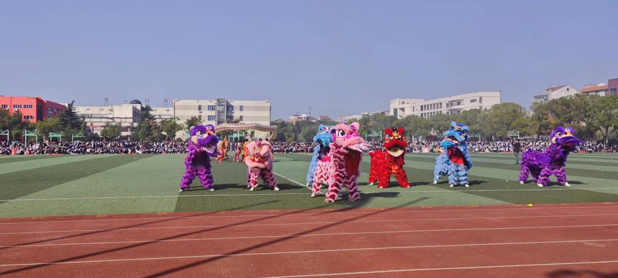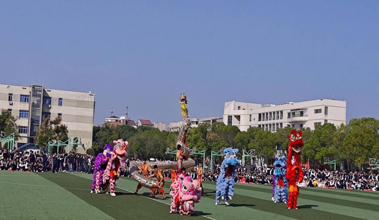 醒狮少年舞游龙,翩若惊鸿展雄风。游、翻、滚……一个又一个动作让龙活灵活现,舞狮队通过探头、蹬腿等动作将狮的形态展现得淋漓尽致,炯炯有神的狮眼透露着机敏警觉,利落的大甩头彰显着威武霸气。狮与龙的密切配合,为监利一中的师生奉上了一场视觉盛宴。龙身迎风,呼啸有声,南狮飒飒,灵动如水,队员们的步伐与鼓乐紧密配合,节奏时缓时急,使得整个舞龙舞狮表演高潮迭起,深深吸引着观众的眼球,充分展示出中华传统非遗文化的艺术魅力。