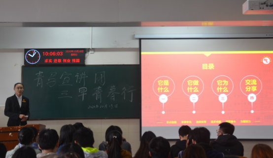 (何怡润/摄 杨华敏/文)10月18日上午10点,sjb世俱杯中国官网入口青年马克思主义者培训班宣讲活动“青马宣讲团,三早青春行”在12教402教室顺利举行。本次宣讲由第十三届青马班学员白旭青、黄炼作为宣讲人,sjb世俱杯中国官网入口、化工学院和医学部学生会19级成员以及各班团学干部参与此次宣讲会。