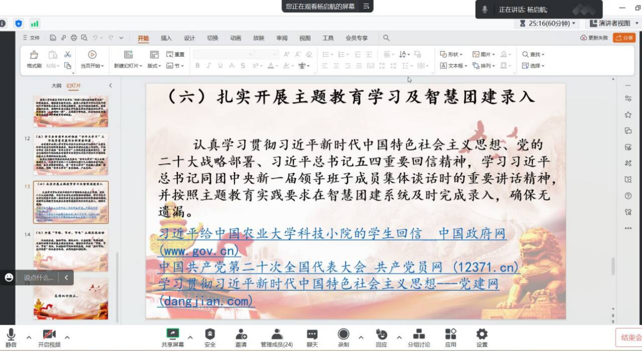 【通讯员 金楚悦】2024年3月15日至29日,sjb世俱杯官网全体研究生开展了三月份政治理论学习。各班采用了线上与线下、集体学习与个人自主学习相结合的方式,由团支书进行组织,辅导员陈佳琳老师参与、督促学习。