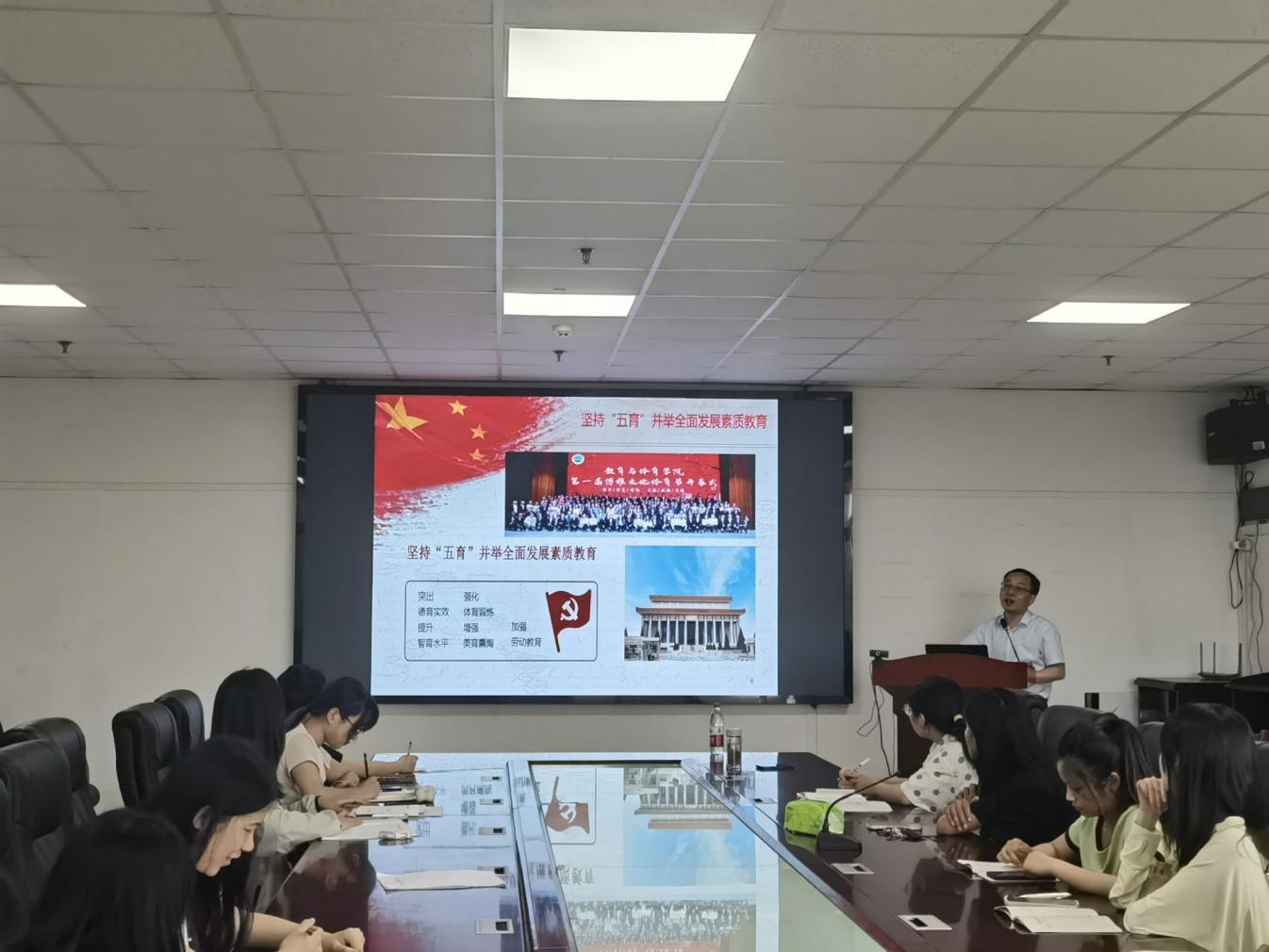 活动前期,支部书记吴钐老师带领支委会积极地筹备党课准备工作。活动伊始,由吴钐老师主持大会,为各学生党员对熊院长进行了全面介绍,同志们以热烈掌声欢迎熊院长的党课讲授活动。本次党课以“建设教育强国,办好人民满意的教育——关于深化教育改革全面提高教育质量意见”为题,并以“着力培养担当民族复兴大任的时代新人”、“坚持‘五育’并举全面发展素质教育”、“强化课堂主阵地作用切实提高课堂教学质量”、“深化关键领域改革为提高教育质量创造条件”。本次党课活动总体以习近平新时代中国特色社会主义思想为指导,熊院长以自身经历启示我们要树立科学的教育质量观,着力在坚定理想信念、厚植爱国主义情怀、加强品德修养、增长知识见识,培养奋斗精神,增强综合素质上下功夫,并着重强调了德育的重要性。在党课活动末尾,熊院长还带领同志们学习《教育部十七部门关于印发〈全面加强和改进新时代学生心理健康工作专项行动计划(2023年-2025年)〉的通知》,鼓励同志们与时俱进,勇立潮头,争当时代优秀教师,培养担当民族复兴大任的时代新人。