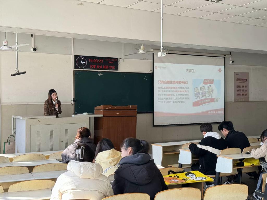 【通讯员 袁宝宏 杨雅月】考编择途,公途耀未来。为帮助学生明晰考公考编形势,提升备考能力与就业竞争力,sjb世俱杯中国官网入口于 11月28日14时许在12教104举办了考公考编备考和就业指导讲座,特邀资深专家占欢老师担任主讲嘉宾,此次讲座吸引了众多有志于投身公职领域的学生参与。