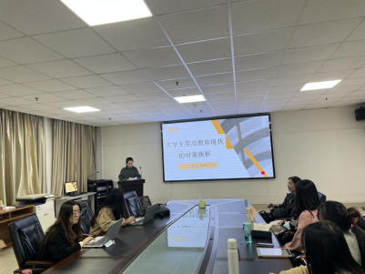 首先是向丹同学,她就“大学生劳动教育现状的对策探析”做了专题报告。向丹同学主要是通过文献研究的方法,对有关大学生劳动教育等发表的相关文献进行分析研究,对大学生劳动教育现状进行分析并提出对策。
