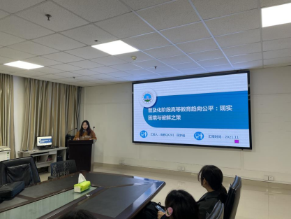 最后是田梦谣同学,她就“普及化阶段高等教育普及化阶段高等教育趋向公平:现实困境与破解之策”做了专题报告。田梦谣同学主要从研究背景、高等教育公平概述、现实困境、破解之策等四个方面来进行高等教育趋向公平的分析和研究,条理清楚、分析得当,让同学对普及化阶段高等教育有了更深的理解。