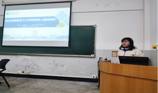 第四位汇报人是魏子琪,其汇报主题是“融合发展理念下小学劳动育人途径探析”。她的主要研究内容是明确小学劳动教育与德育进行融合的必要性,从认知、态度、行动三方面来分析小学劳动教育与德育融合发展时产生的阻碍,结合国家颁布的纲要性文件和融合发展产生的阻碍,探讨小学劳动育人路径建构。