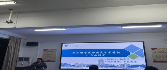 再者是体育教育训练学专业的杨惠兰同学,她就“来华留学生中国武术素养提升方略研究”做了专题报告。她详细介绍相关概念的内涵阐释,包括素养、武术素养、武术道德素养、武术文化素养、武术技术素养,探讨来华留学生武术素养现状审思以及来华留学生武术素养提升方略进行汇报。