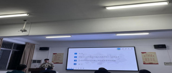 最后是体育教育训练学专业的廖子锋同学,他以“学校武术教学融入优秀传统文化的策略研究”做了专题报告。他通过文献资料法、历史分析对比法两类研究方法以加强学校武术教学中融入优秀传统文化的现实意义和实现优秀传统文化融入学校武术教学的策略两个部分进行详细汇报。
