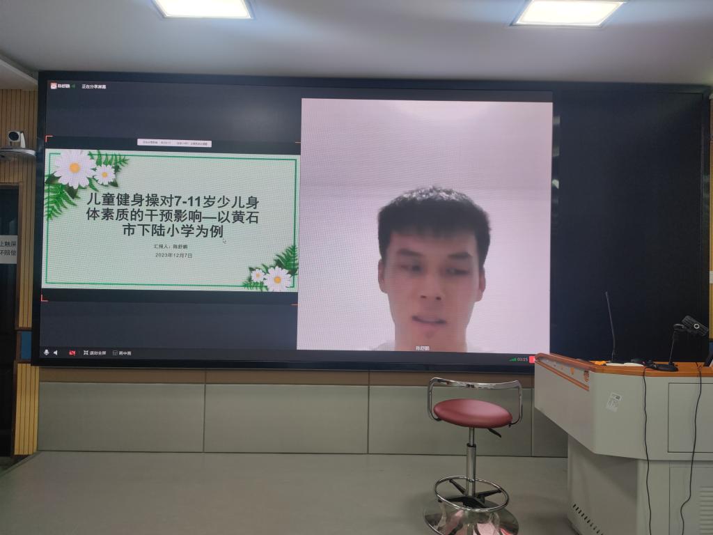 陈舒鹏同学的汇报主题为“儿童健身操对7-11岁少儿身体素质的干预影响——以黄石市下陆小学为例”。陈舒鹏指出,党和国家高度重视青少年体质问题,为此,湖北省体育局、湖北省教育厅下发了《2022年湖北省青少年体制健康干预试点工作实施方案》,据此,本项研究通过运动干预操对黄石市下陆小学二至四年级学生身体素质的各项指标的结果进行处理分析,该项干预试点工作为期三年。目前研究结果发现运动干预操仅在五十米跑、握力、PACER、闭眼单脚站立这四个指标上有一定效果,后续需对干预设计进行进一步的改进并继续追踪。