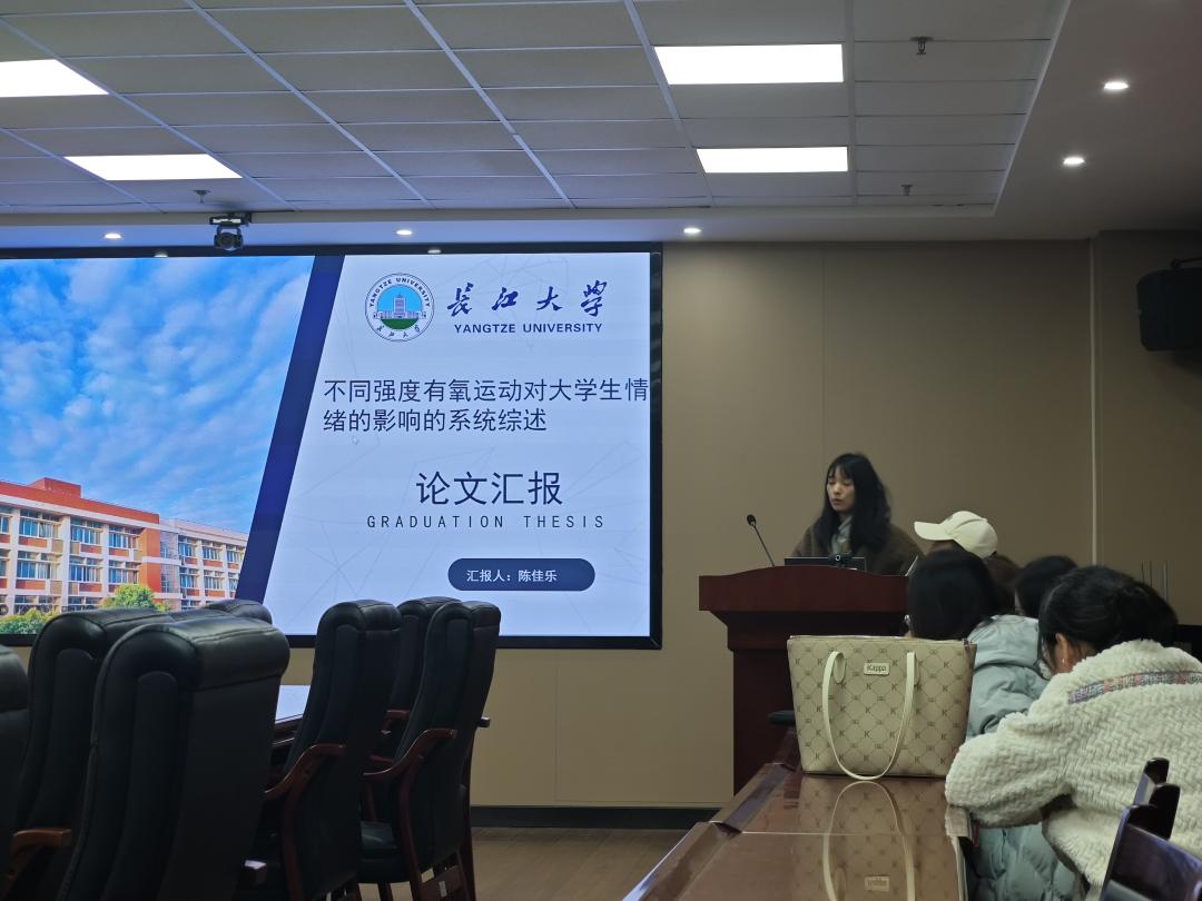 陈佳乐汇报的主题是《不同强度有氧运动对大学生情绪的影响的系统综述》,她以大学生心理健康问题、心理健康影响因素分析、提升心理健康的重要性和有氧运动的心理益处作为研究背景,利用文献资料法对于之相关的文献进行检索,通过筛选与排除最总选择了十篇文献作为研究对象,对不同强度有氧运动对大学生情绪的影响的进行了系统分析和描述。