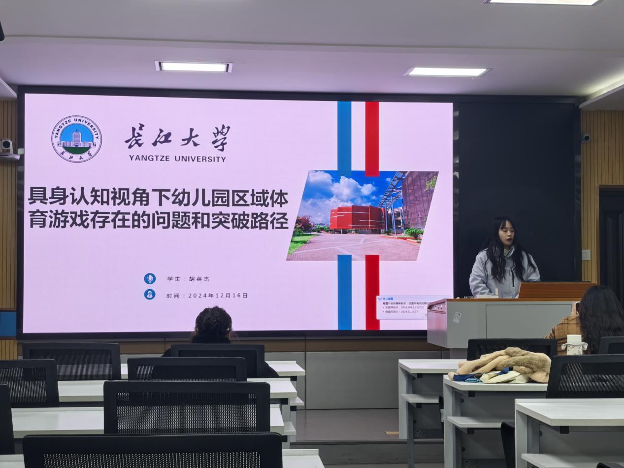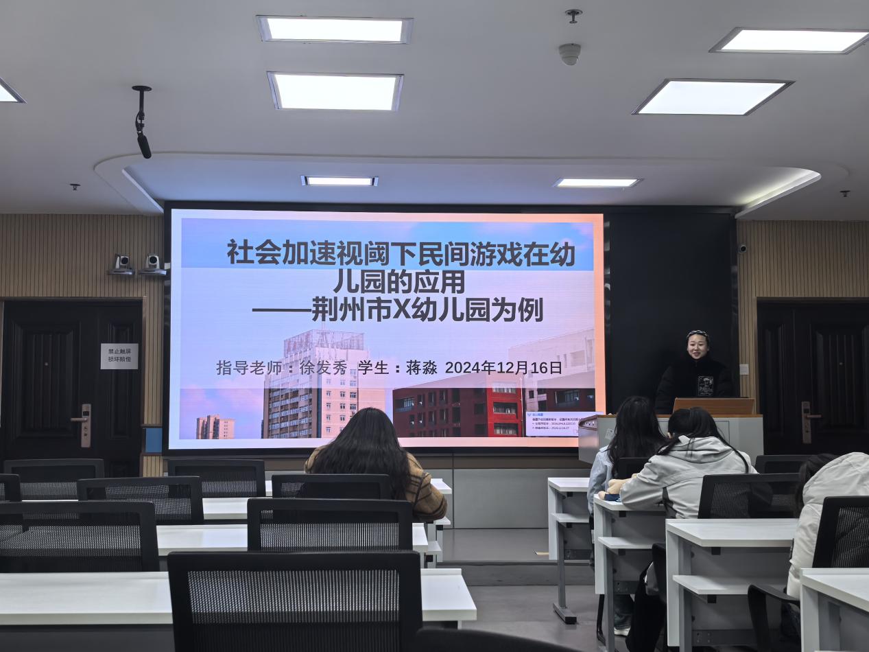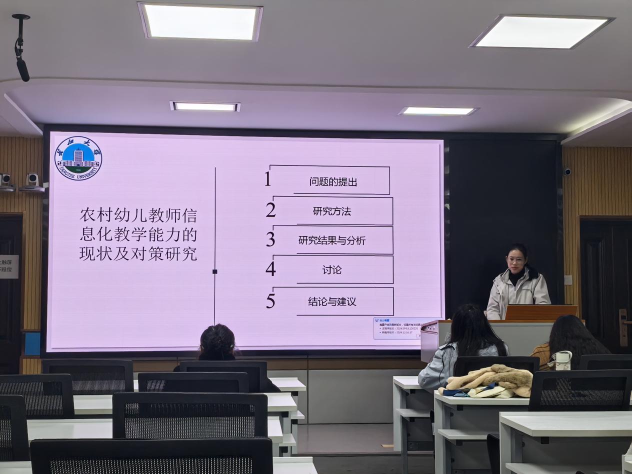(通讯员 秦源)2024年12月16日晚,sjb世俱杯中国官网入口第六届研究生学术科技节第七场活动在文科大楼910报告厅举行。本次汇报人是学前教育学方向的研究生蒋淼、胡英杰、侯晓曼、赵玉娇,sjb世俱杯中国官网入口2023级、2024级学前教育专业研究生前来学习观摩。院研究生会宿建部部长周璇主持了本次活动。