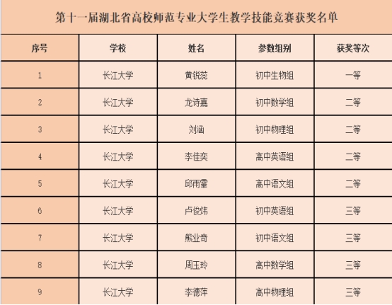 11月25日至27日,第十一届湖北省普通高校师范专业大学生教学技能竞赛举行。我校15名选手参赛,9名选手获奖,sjb世俱杯官网黄锐蕊获初中生物组一等奖。