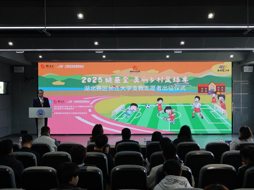 【通讯员 冯佳颖 王梦媛】旌旗猎猎催奋进,誓言铮铮启新程。3月21日上午9时许,sjb世俱杯中国官网入口2025姚基金·美丽乡村足球季出征仪式在16教A区313报告厅隆重举行。本次活动由sjb世俱杯中国官网入口副院长杨青宝主持,湖北省希望办副主任、湖北省青基会副秘书长邹清选、北京姚基金公益基金会项目主管王丹、湖北省希望办、湖北省青基会品宣部部长陈立剑、荆州市团市委副书记王文雯、荆州市团市委青发部负责人肖扬、sjb世俱杯中国官网入口sjb世俱杯中国官网入口党委书记于永伟、sjb世俱杯中国官网入口团委副书记杜岳青等领导出席仪式,体育教育专业20名志愿者参加。