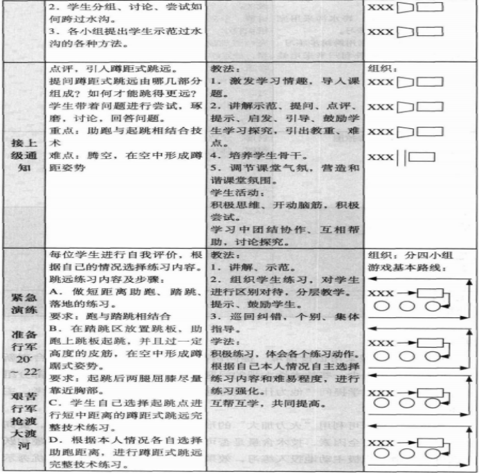 高二年级学生有一定的跳远基础,大多数学生能完成蹲距式跳远的完整技术动作,但学生的掌握程度参差不齐,个别差异明显。在助跑与起跳相结合和腾空技术上需进一步改进提高。